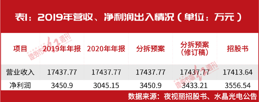若根据水晶光电2020年11月7日发布的分拆预案,夜视丽2019年的营收和净利润分别为17437.77万元、3450.90万元,显然该数据又跟2019年年报是一致的,但要按照水晶光电2022年3月15日发布的分拆预案(修订稿)来看,夜视丽2019年的营收和净利润又变为17437.77万元、3433.21万元,营收虽然一致,但净利润数据却又有了区别。