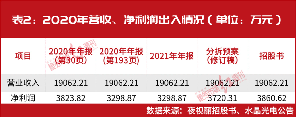 若按照分拆预案(修订稿)来看,夜视丽营收数据不变,但净利润却是3720.31万元。综上来看,在水晶光电的三份公告文件中,关于夜视丽2020年的营收数据都是19062.21万元,但净利润数据也都有3个版本。