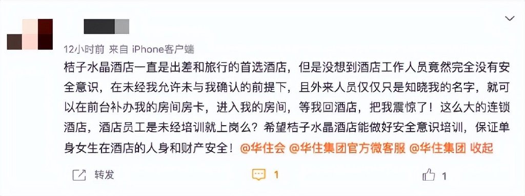 此外,2月8日也有一位女网友曾吐槽:“桔子水晶酒店一直是出差和旅行的首选酒店,但是没想到酒店工作人员竟然完全没有安全意识,在未经我允许未与我确认的前提下,且外来人员仅仅只是知晓我的名字,就可以在前台补办我的房间房卡,进入我的房间,等我回酒店,把我震惊了!这么大的连锁酒店,酒店员工是未经培训就上岗么?希望桔子水晶酒店能做好安全意识培训,保证单身女生在酒店的人身和财产安全。”