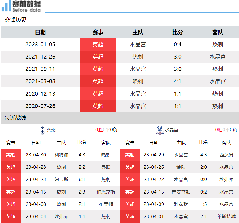 双方近6次交手,热刺3胜2平1负,占据上风。