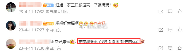 从母女俩合照来看,小水晶手中拿着一根金闪闪的弦管,看来小妮子多才多艺,在美国留学期间已多次登台音乐表演,未来有望接衣钵闯荡演艺圈。评论区下方,粉丝留言称赞虹姐一家三口都是高颜值,幸福美满;亦有夸赞“小水晶好漂亮,完美继承了姐姐和姐夫的优点”!