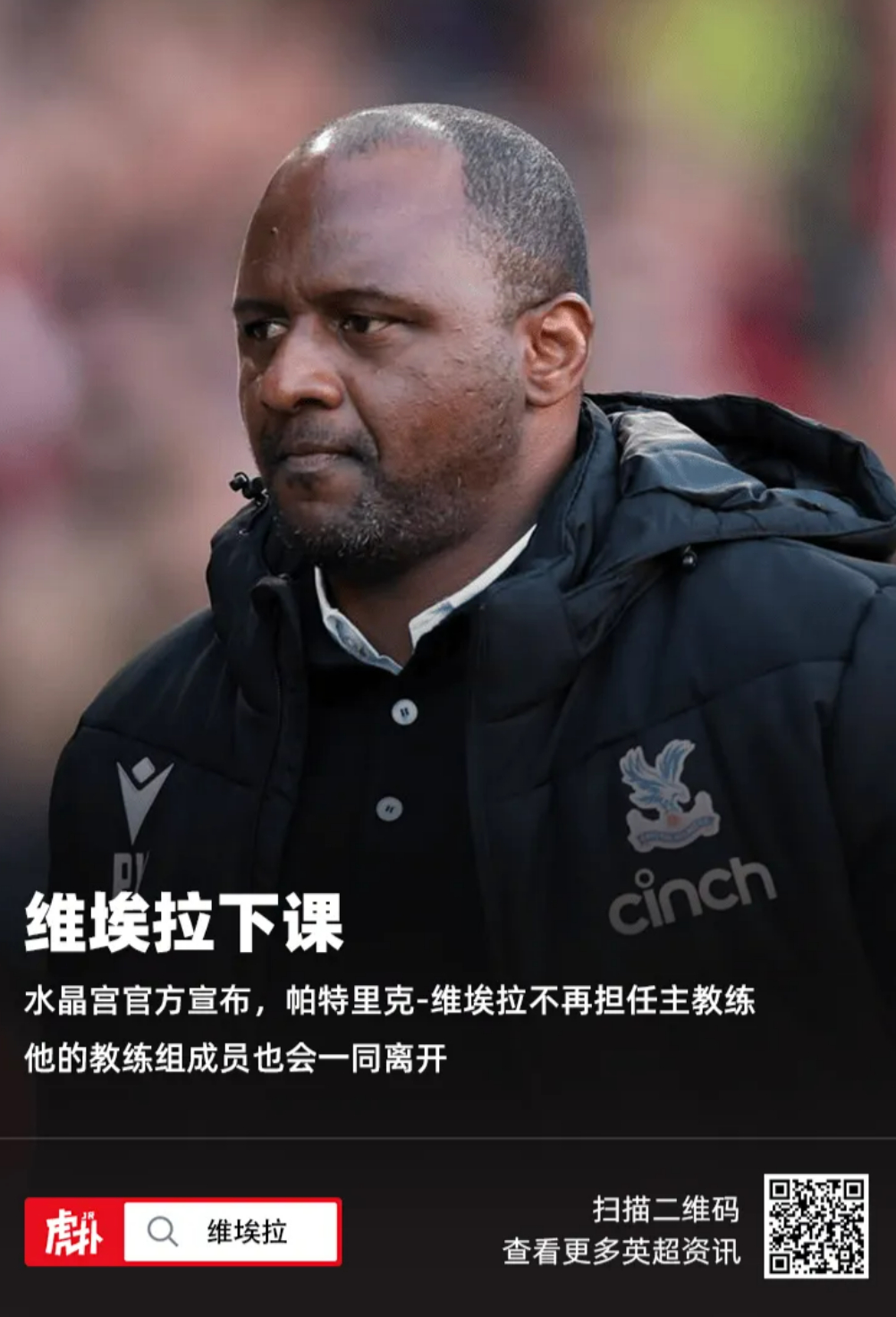【官方:水晶宫主帅维埃拉下课,教练组一同离开】水晶宫俱乐部官方宣布,帕特里克-维埃拉不再担任一线队主教练。他的教练组成员罗伯茨、威尔逊和埃古恩也会一同离开。