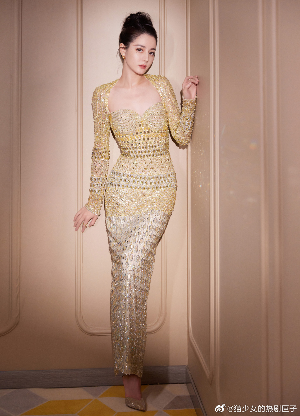 迪丽热巴最新水晶缀饰礼服造型!头发高盘真的高贵又有气场!和昨天的校园风完全两种风格~这个身材和比例我真的狠狠爱住了