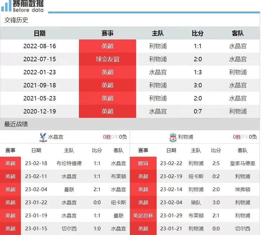 第一:两队情况!英超24轮战罢,水晶宫少赛1场,6胜8平9负积26分排名第十二;利物浦少赛2场,10胜5平7负积35分排名第八,距离前四有7分,但比第四名热刺少赛2场。上轮英超,水晶宫客场1-1战平布伦特福德,近7轮联赛保持不胜(4平3负);利物浦客场2-0击败纽卡,豪取联赛两连胜,周中欧冠主场2-5惨败给皇马,后防线溃不成军 。