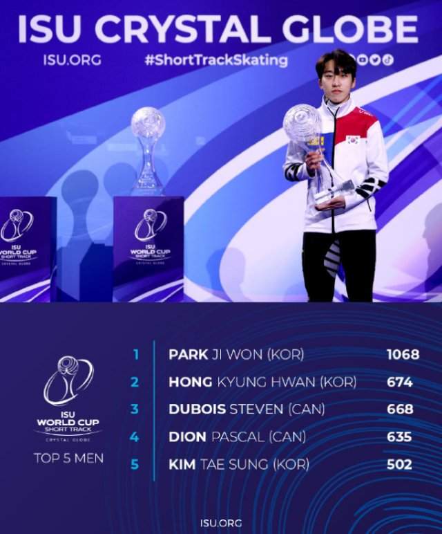 14金4银的成绩,朴智元在世界杯排名总分来到了1068分,位居2022-23赛季世界杯个人全能第一。与排名第二的洪京焕(674分)、排名第三的斯蒂芬•杜布亚(668分)的差距很大。此外,ISU在本赛季世界杯成立25周年之际,以世界杯第1~6站比赛成绩评选男女综合第一名,颁发特别奖杯水晶球,朴智元成为首位获奖者,女子则是舒尔廷。