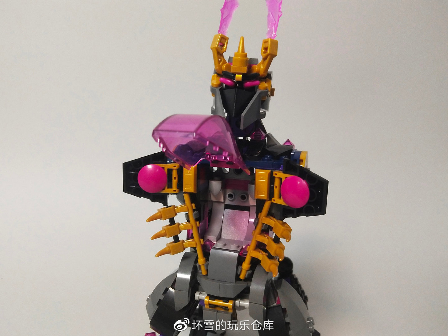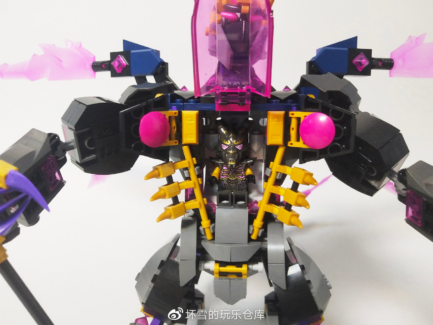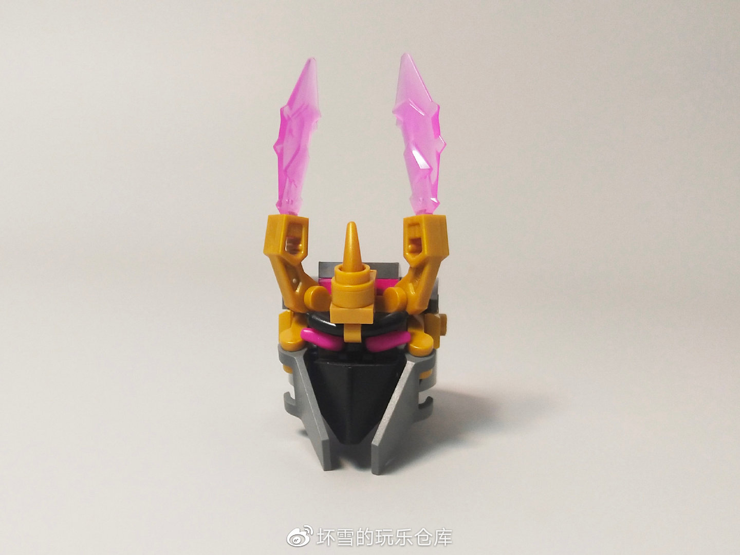 机甲的头部也很有造型感,三角件组装的嘴部和擎天柱的面罩外观一样,两侧的活页旗帜件组成了护脸的挡板。头部的眼睛是两个紫色的牛角件,在悟空小侠系列很常见。金色的王冠搭配顶上水晶刀刃增加了威风感,也体现了它的反派权威。