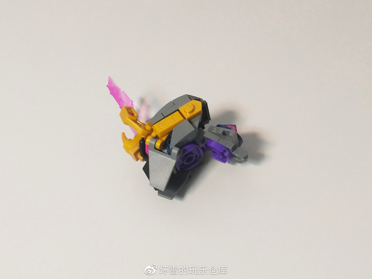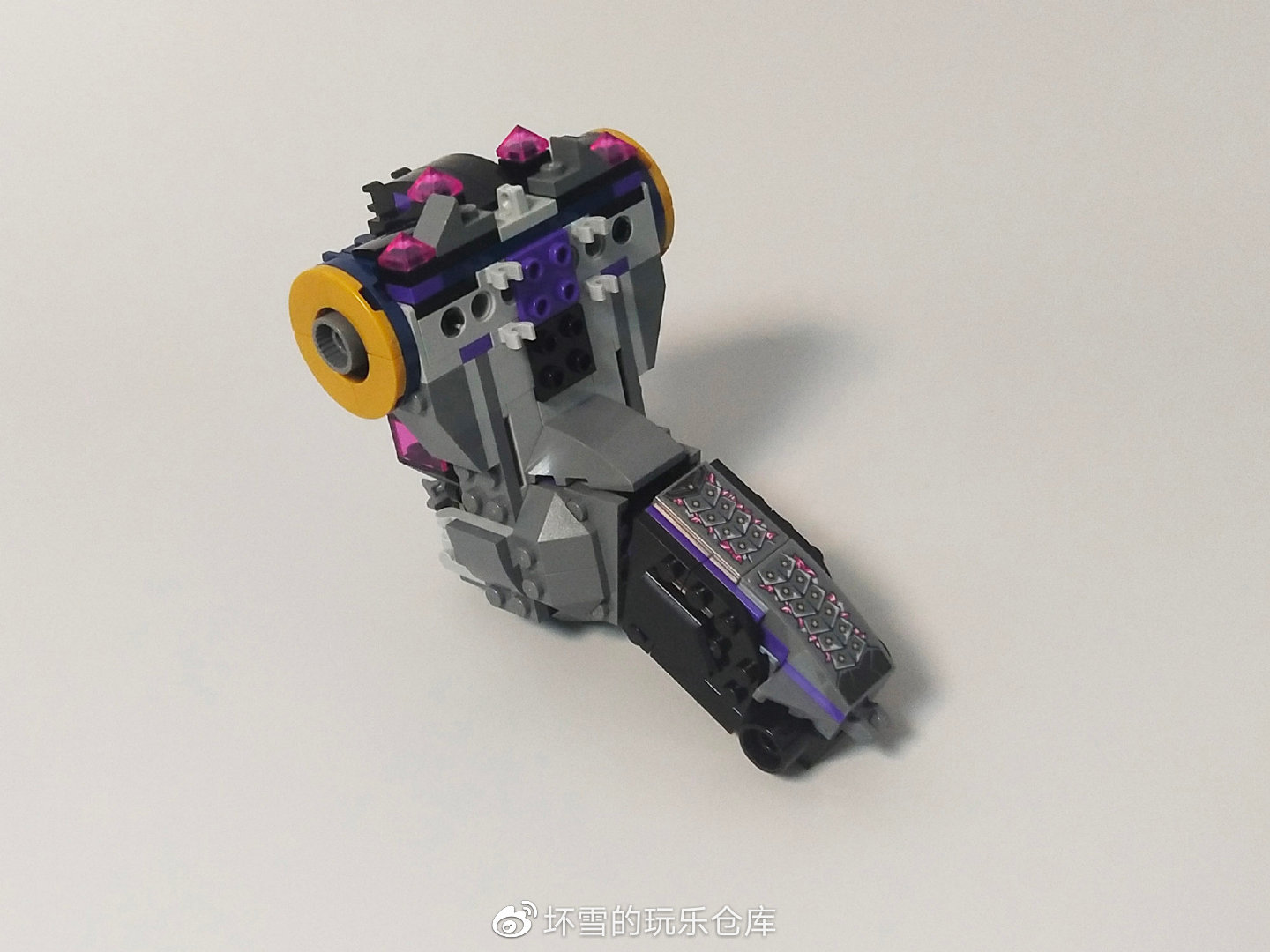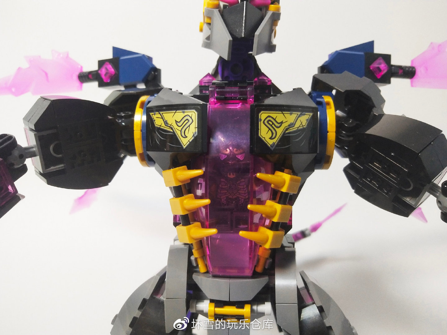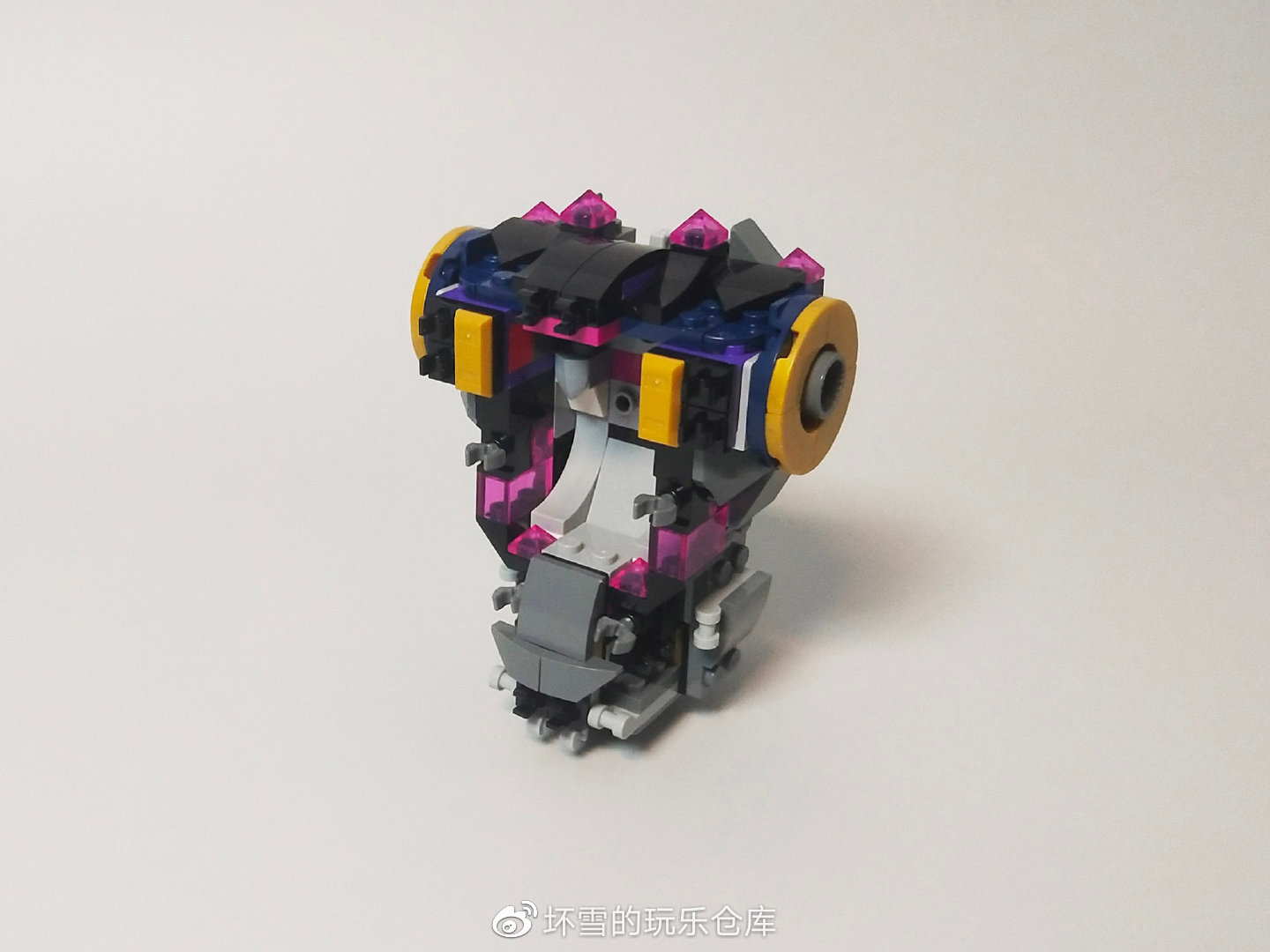 机甲的头部也很有造型感,三角件组装的嘴部和擎天柱的面罩外观一样,两侧的活页旗帜件组成了护脸的挡板。头部的眼睛是两个紫色的牛角件,在悟空小侠系列很常见。金色的王冠搭配顶上水晶刀刃增加了威风感,也体现了它的反派权威。