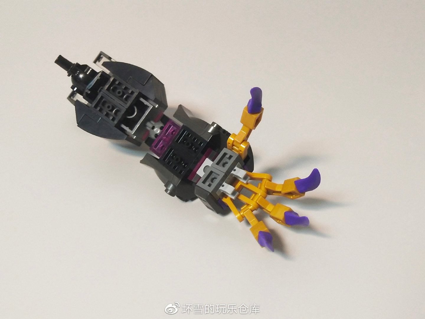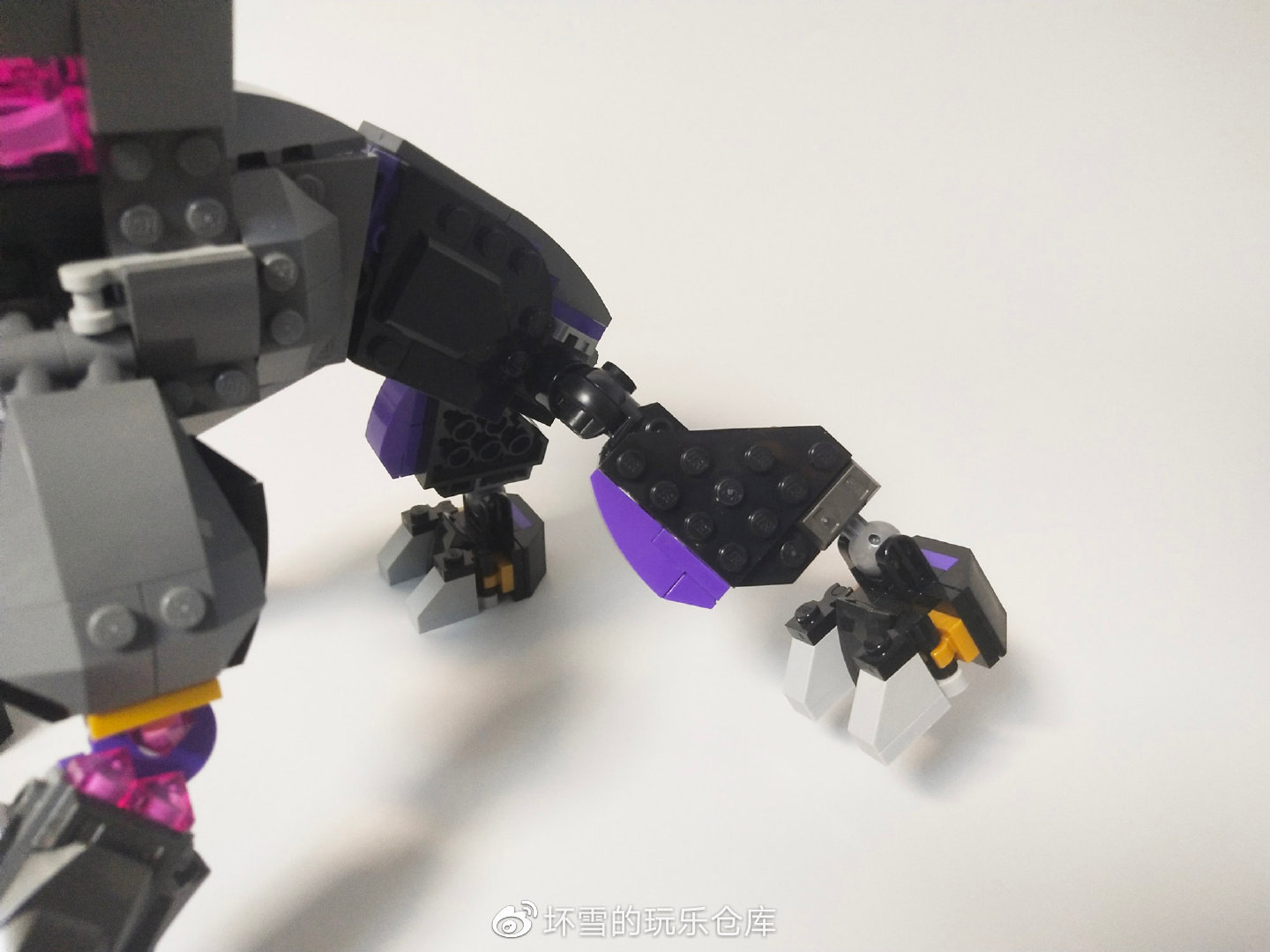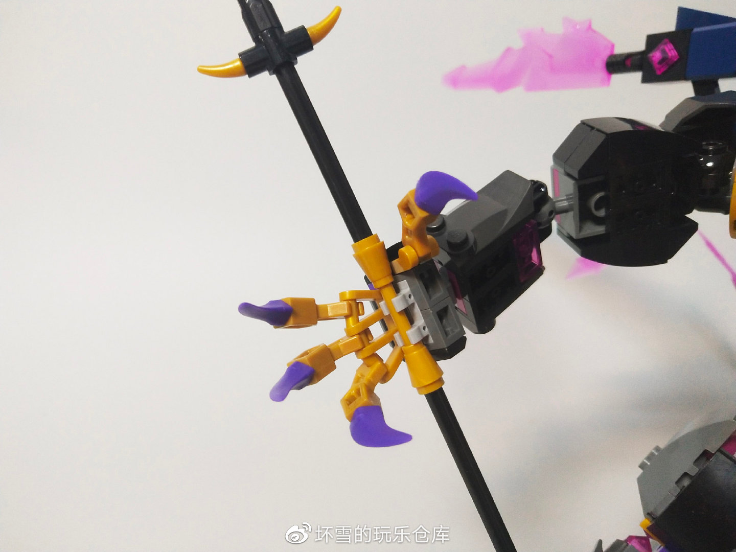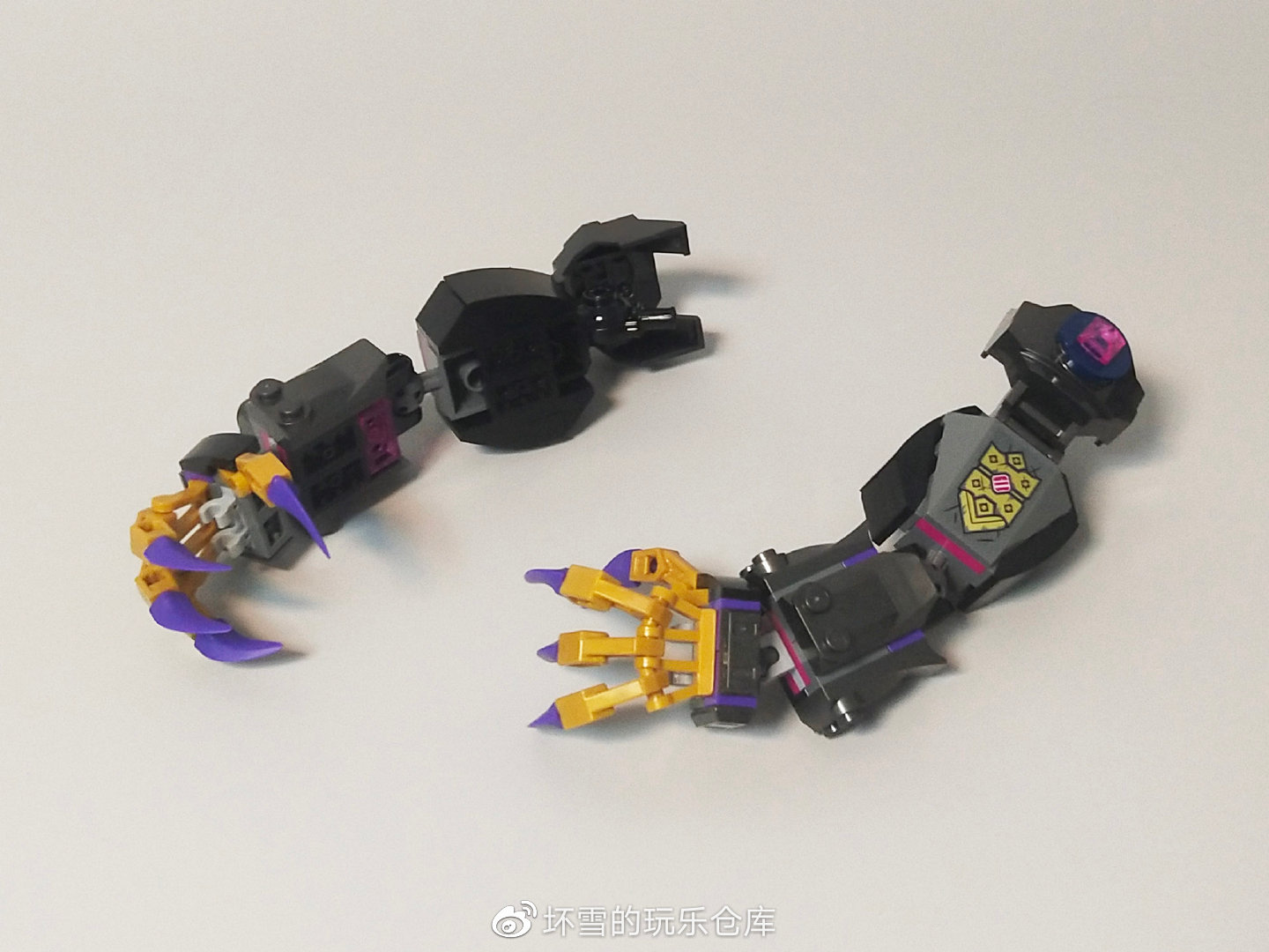 手掌主要用到了一个三向的把手件,可以通过带夹口的机器人机械臂零件实现多个手指的弯曲模拟,该造型也应用在其他套装多个机甲手掌处。手掌侧面还有一个机械臂件,用来模拟拇指。四根手指均可以向内弯曲,并用紫色的尖牙件来模拟锋利的爪子。手掌中心是一组铰夹口,可以用来固定武器。