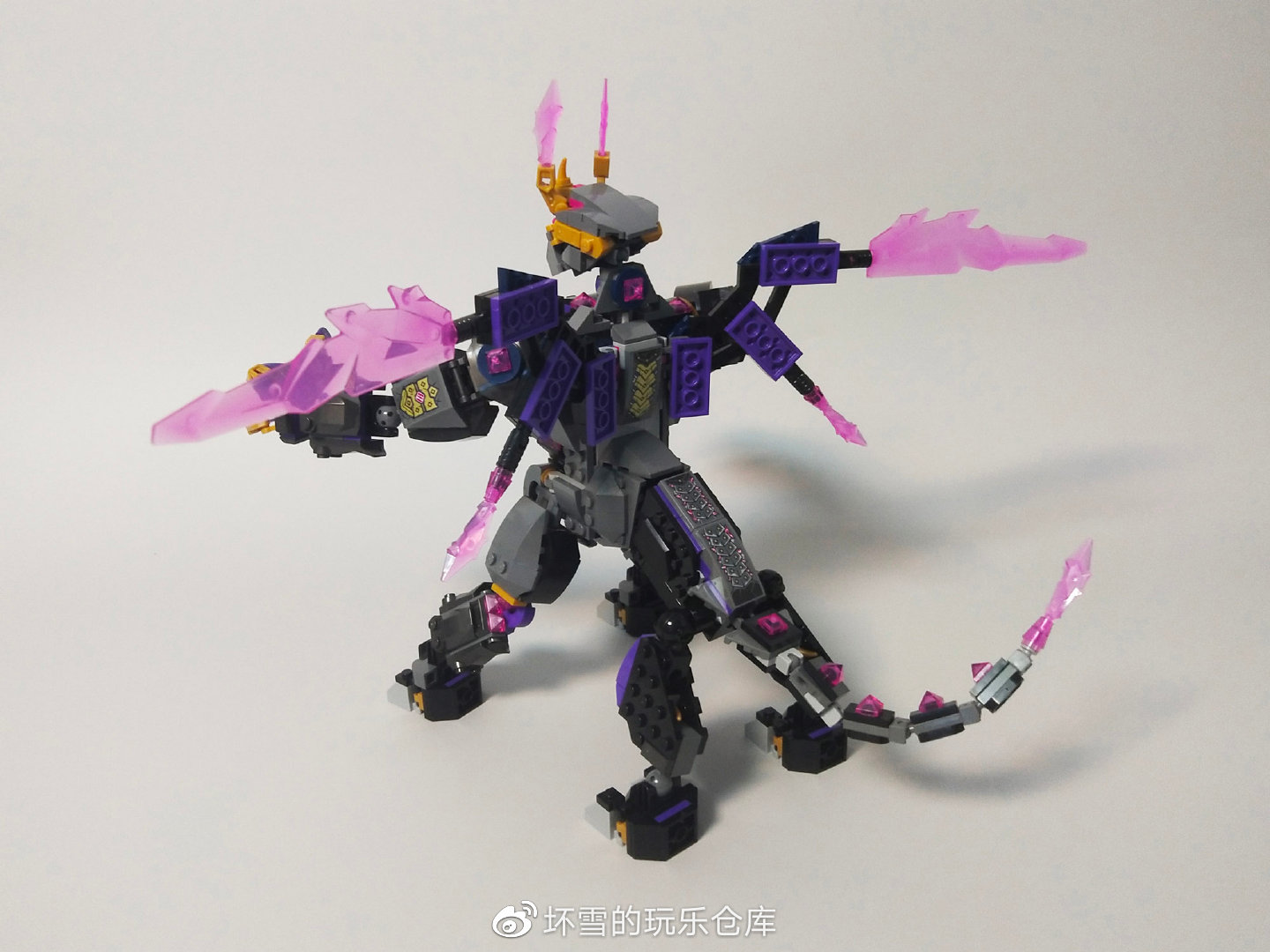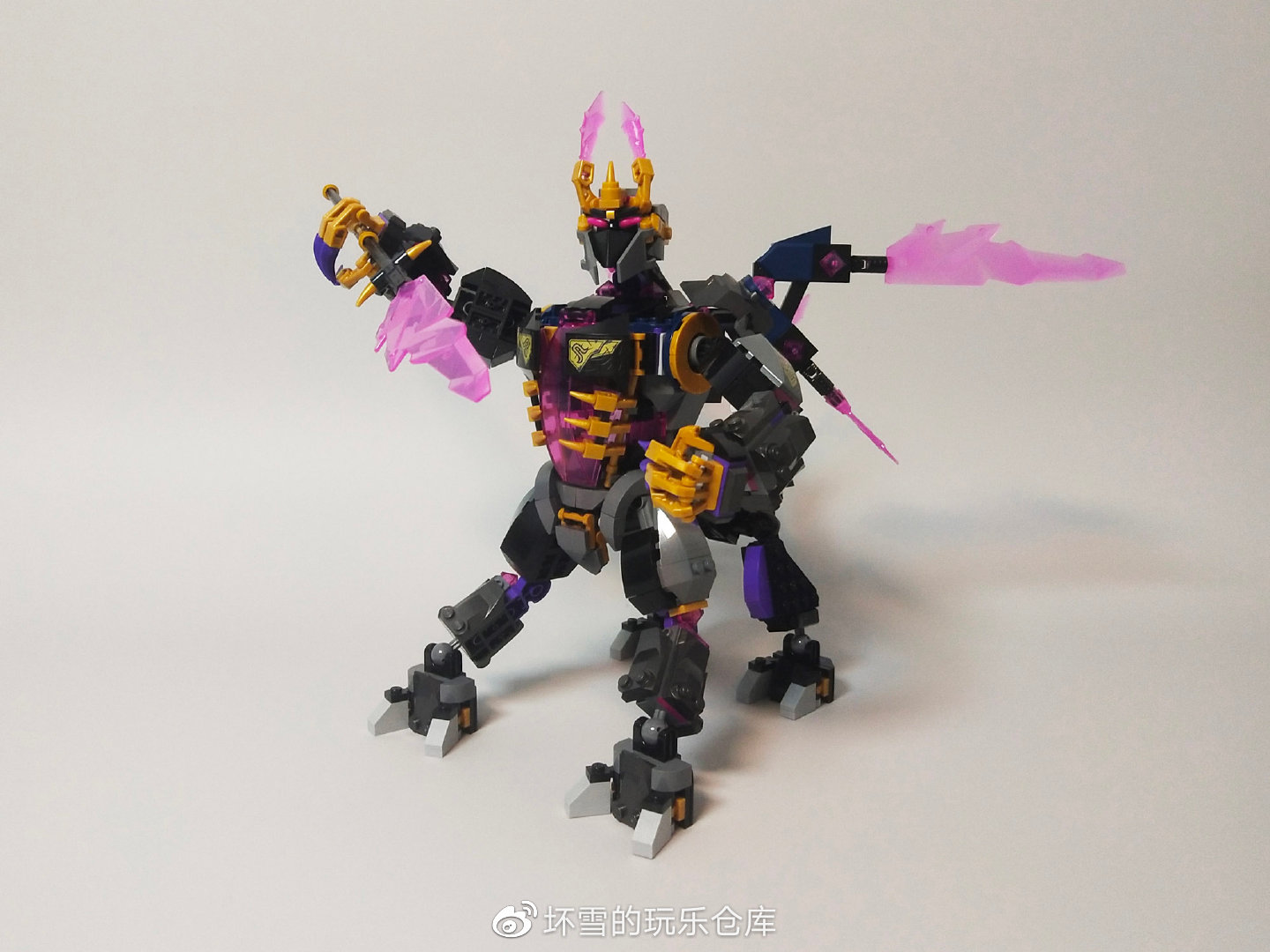 整个机甲体型巨大,两翅展开达到41厘米宽,脚面到王冠最高点达28厘米,前脚尖到尾尖33厘米,名副其实的大型机甲。