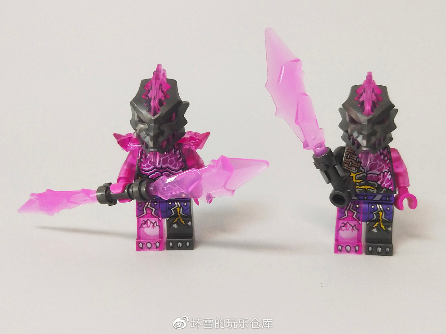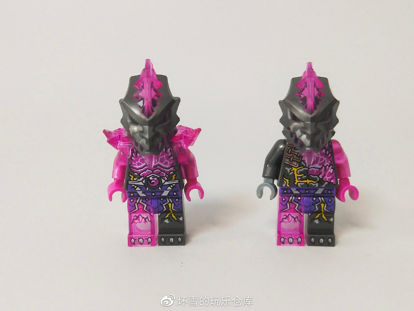 两个人仔的头部都是黑色的复仇石质感的鬼脸加上粉色水晶效果的尖刺,腿部也是同样的半边复仇石半边水晶化的效果。两个人仔的区别首先在于躯干上的印刷,复仇石守卫躯干的水晶质感更多一些。其次和复仇石士兵左臂水晶化,右臂还是复仇石质感不同,复仇石守卫的双臂均是水晶效果,而且还多了一副水晶肩甲。