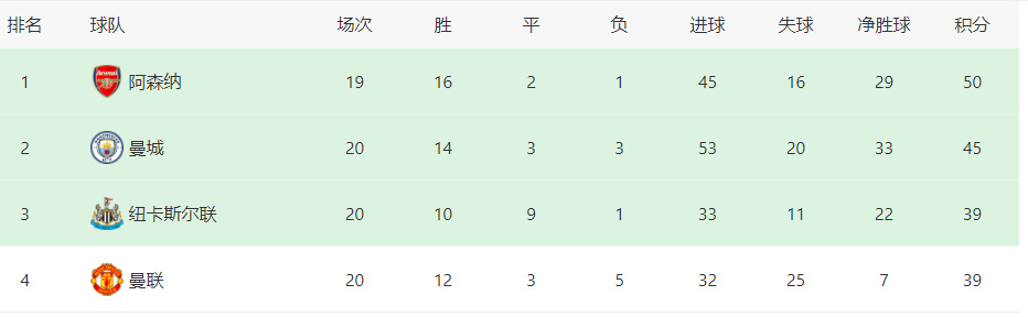 本赛季,曼联低开高走,前面20轮战罢,12胜3平5负,积39分,虽然和第3名的纽卡斯尔联积分相同,但由于净胜球的劣势,暂时排在英超第4名。距离榜首阿森纳还有11分的差距,依旧存在争冠的可能。