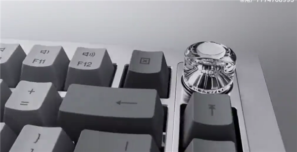 有意思的是,该键盘的右上角配有一个水晶版的旋钮,应该是音量调节旋钮。