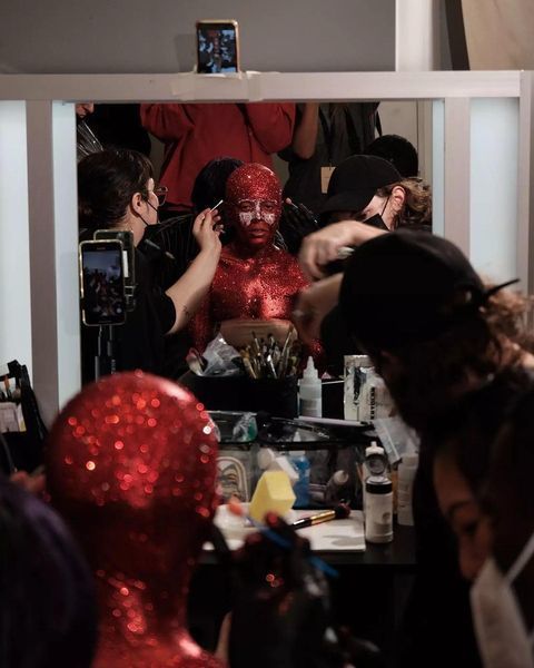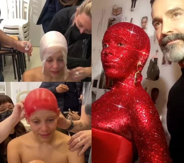 最开始是要进行“人体彩绘”,把猩红色的颜料从头皮开始涂满全身,进而再在裙子覆盖不到的皮肤上,粘上红色的施华洛世奇水晶,总共贴了30000颗,都是手工完成的。