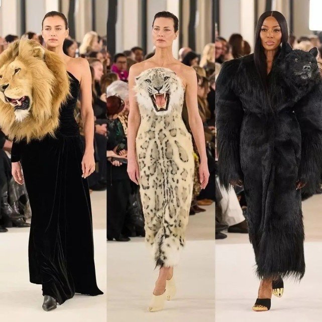 狮子头当天也在T台上进行了展示,由俄罗斯超模伊莲娜·沙伊克穿在了身上(裙子和凯莉的那条不同),与此同时白虎头,黑豹头,也都出现在了秀场上。