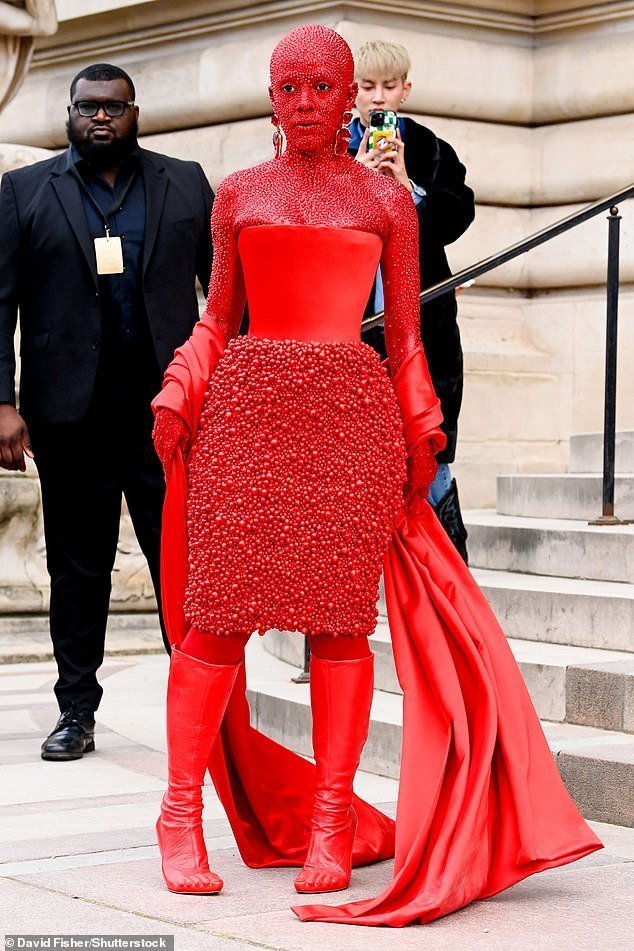 虽说狮子头夺目,但全身火红的那个人,更是“大放异彩”,被描述为“秀场来了外星人”。