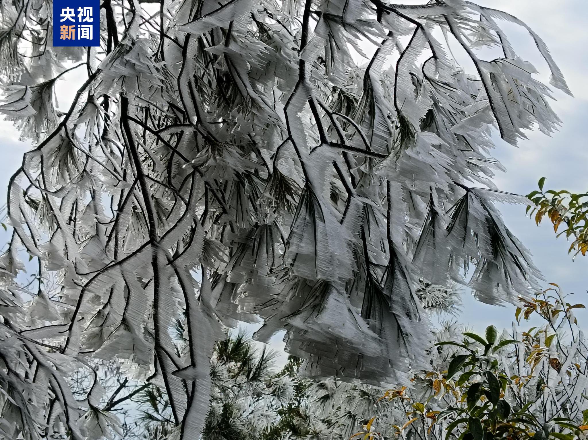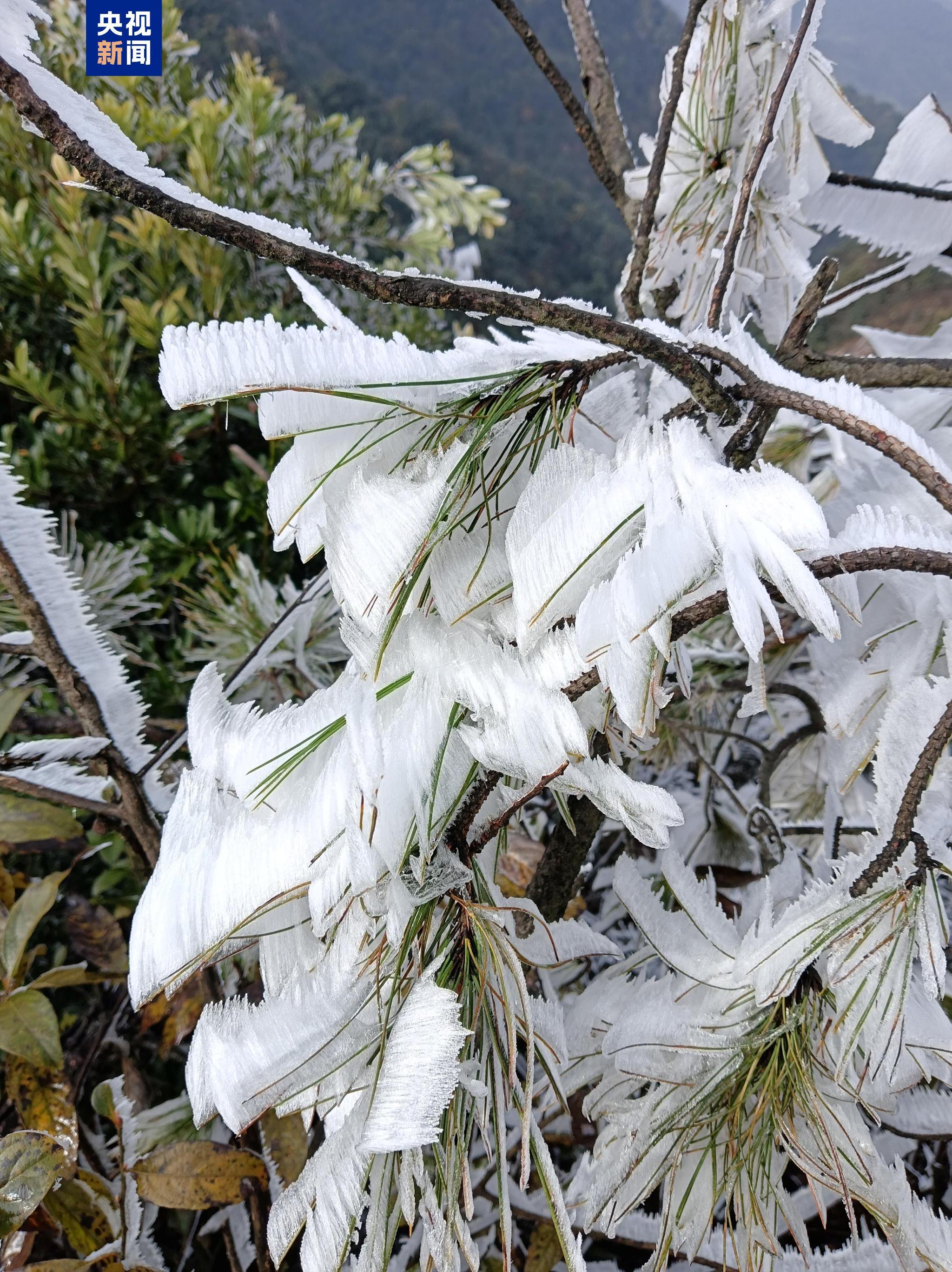 上午9时,当地村民在山间拍摄到这一美景:凛冽寒风将水汽凝结在树枝、黄叶上,每一根枝条都裹着剔透冰晶。宛如玉雕琼枝,在寒风中轻轻摇曳。阳光初露,冰晶折射出细碎光芒,整片山林清冷而璀璨。
