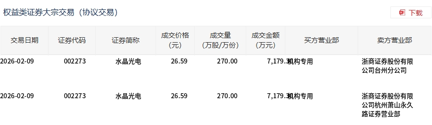 2月9日,水晶光电大宗交易成交540万股,成交额1.44亿元,占当日总成交额的7.35%,成交价26.59元,较市场收盘价27.02元折价1.59%。